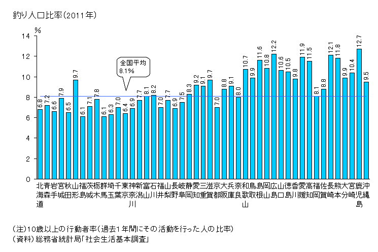 北陸など平均値を下回り、川も海も良い釣り場があるにも関わらず釣り人口は少ない。